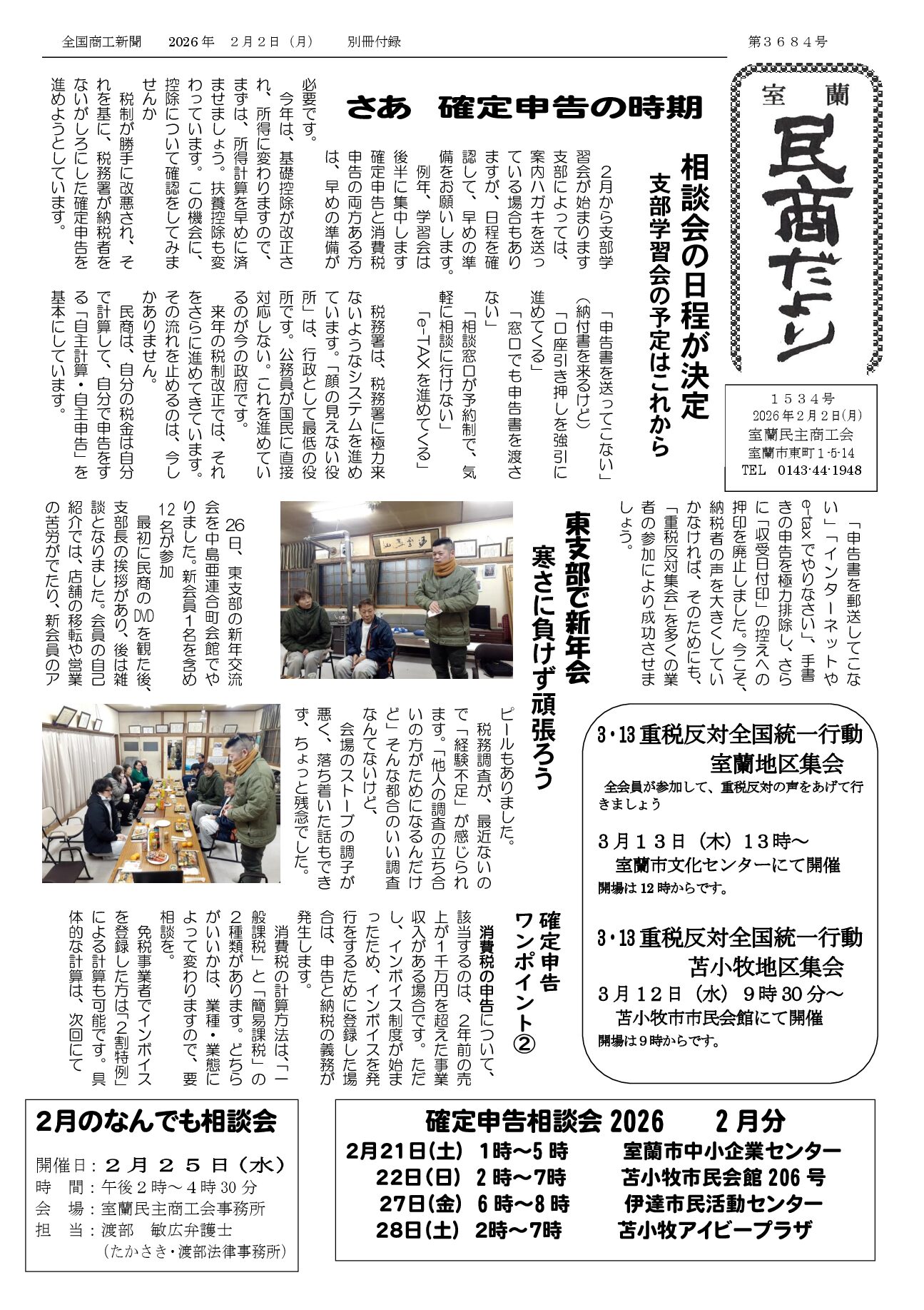 確定申告、その他悩みは 室蘭民商へ相談を!!